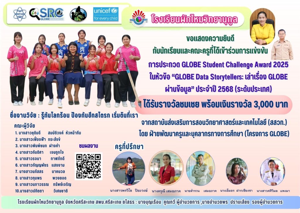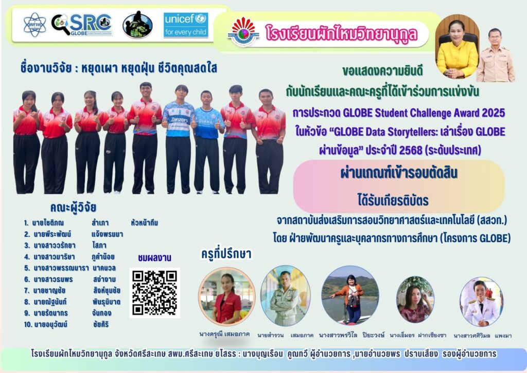 ได้รับเกียรติบัตรจากสถาบันส่งเสริมการสอนวิทยาศาสตร์และเทคโนโลยี (สสวท.) โดย ฝ่ายพัฒนาครูและบุคลากรทางการศึกษา (โครงการ GLOBE) หัวข้อวิจัย : หยุดเผา หยุดฝุ่น ชีวิตคุณสดใส (1 ใน 84 ทีมที่ผ่านเกณฑ์การประกวดเพื่อเข้าสู่รอบตัดสินทั่วประเทศ) ผ่านเกณฑ์เข้ารอบตัดสิน